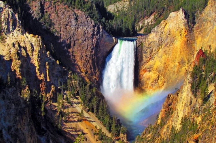 Bigger streaks of colors than the usual can be seen at the bottom of the falls at the Yellowstone National Park in Wyoming, U.S.A.